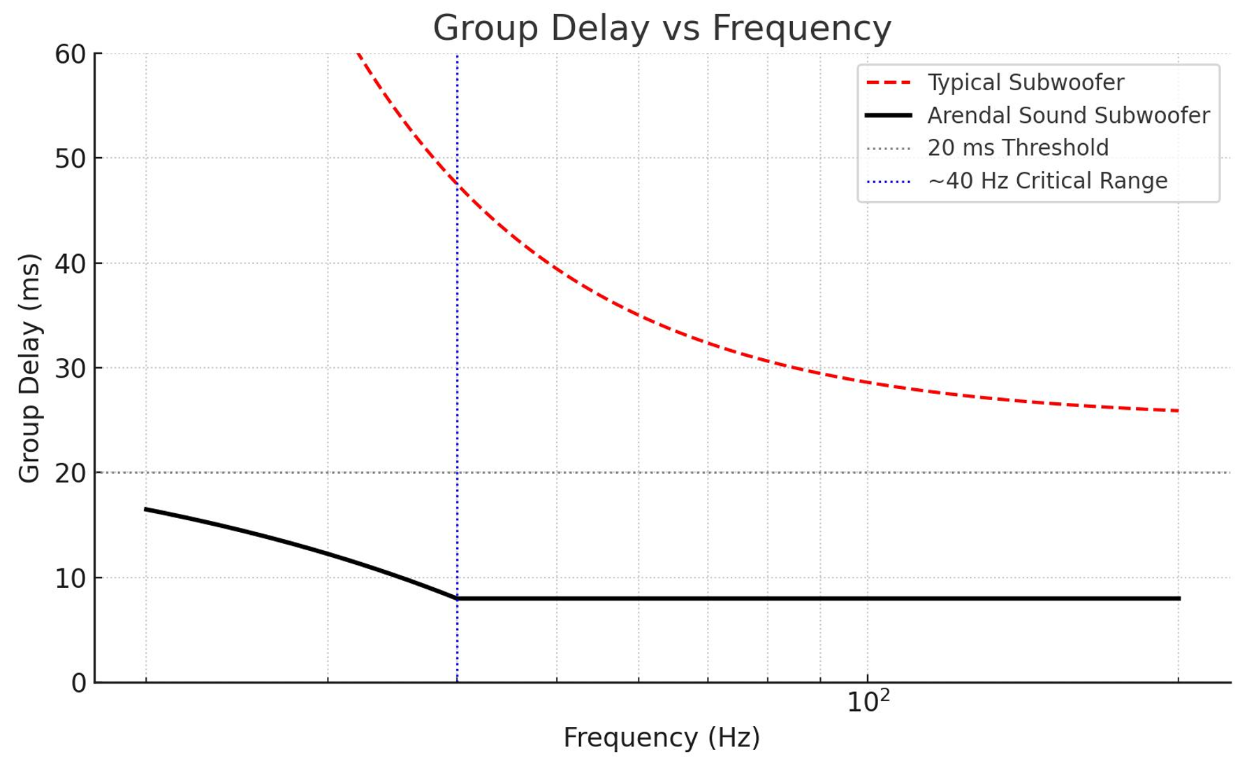 Below is a comparison showing how Arendal Sound subwoofers maintain ultra-low group delay where it matters most: